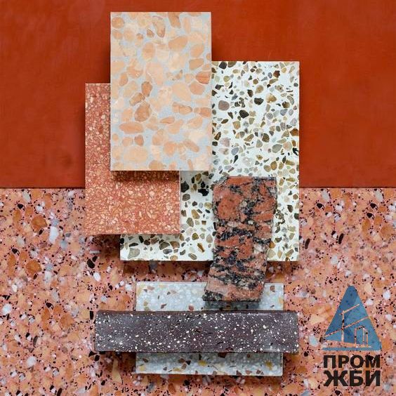 Высокопрочный бетон терраццо схож по составу с другими типами подобных бетонов, исключение – лишь наполнитель из гранитных или мраморных фрагментов. В остальном в состав входят: